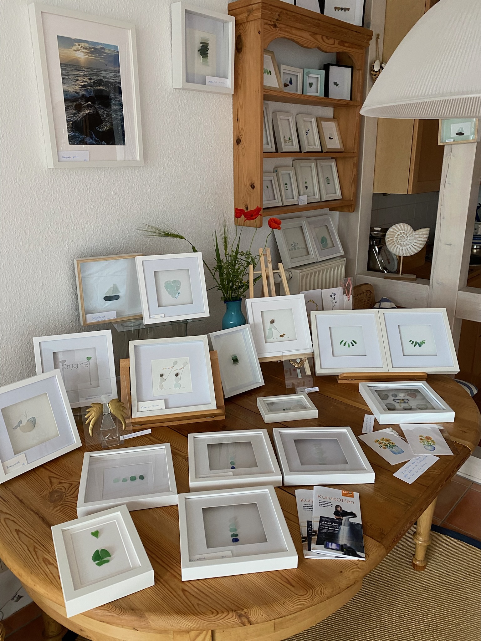 In meinem Atelier finden Sie Schmuck aus Meerglas und Sterlingsilber, Bilder und Collagen mit Meerglas sowie Objekte aus Treibholz und Meerglas neben Aquarellen und Fotografien.